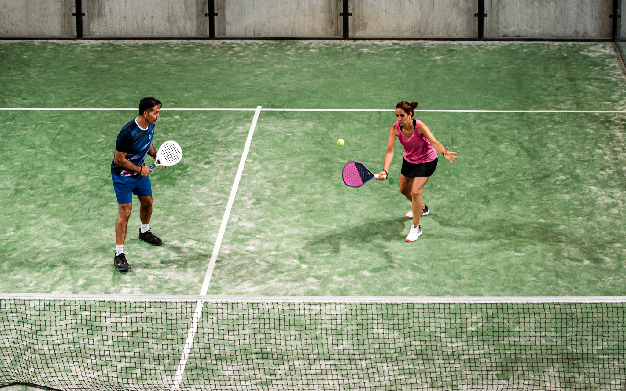 Le terrain mesure 20m par 10m, avec des parois de 3 à 4 mètres de haut qui font partie intégrante du jeu. Vous pouvez renvoyer la balle après rebond sur une vitre, jouer à la volée, ou même smasher pour la faire sortir du terrain. Le padel mélange les règles du tennis et du squash, avec un maximum de dynamisme.